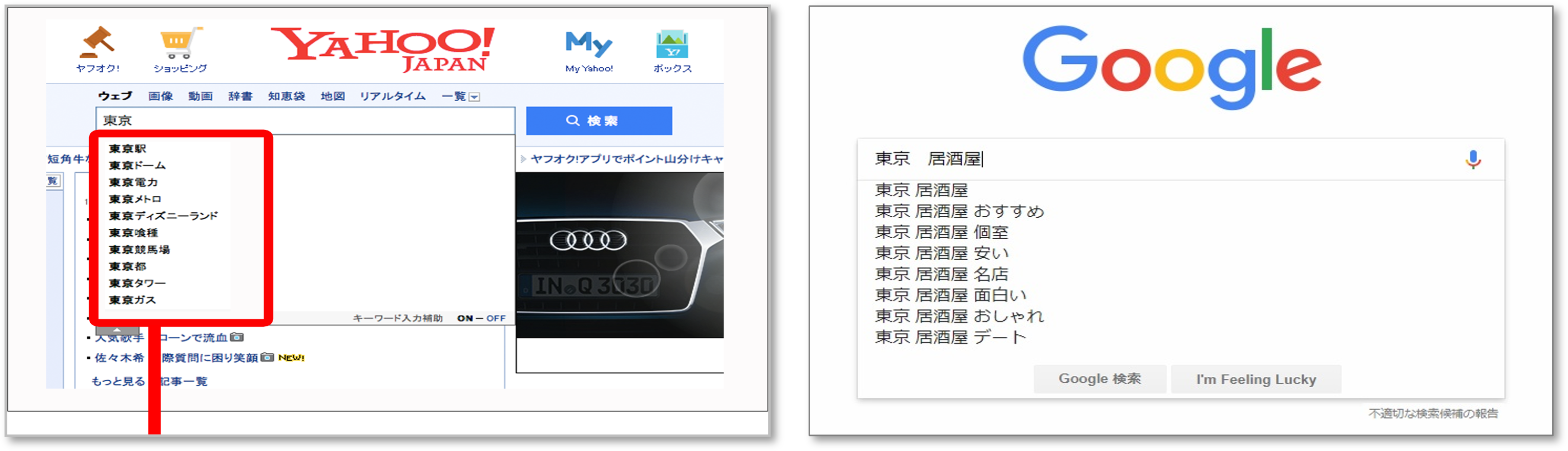 Google検索エンジンにおいて、検索窓にキーワードを入力した際に表示される入力補助枠のこと。