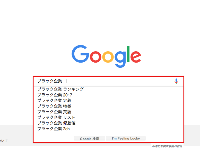 検索窓での「会社名」「サービス名」などを検索時に、予測変換に表示されたネガティブワードを非表示にする対策です。