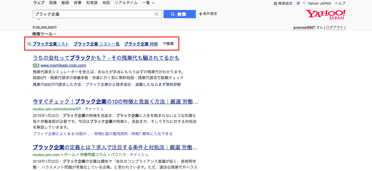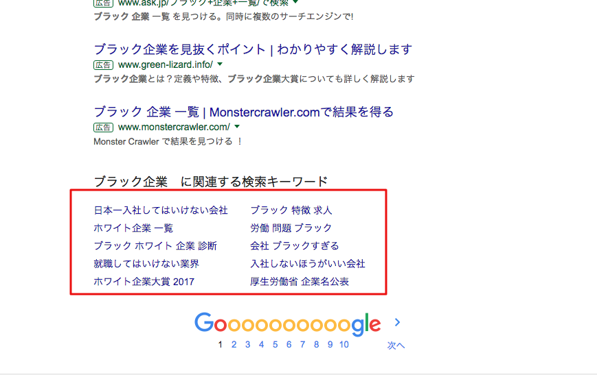 検索したキーワードと関連性の高いキーワードが検索結果に表示される枠のこと。
