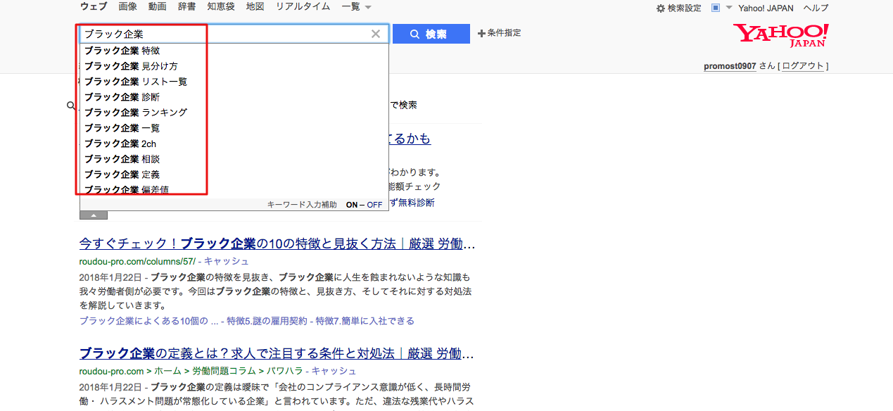 検索関連枠での「会社名」「サービス名」などを検索時に、予測変換に表示されたネガティブワードを非表示にする対策です。