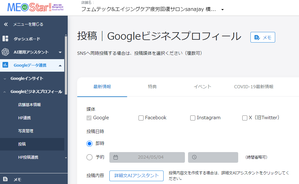 Googleビジネスプロフィールと同時に各種SNSに同一内容を投稿できます。