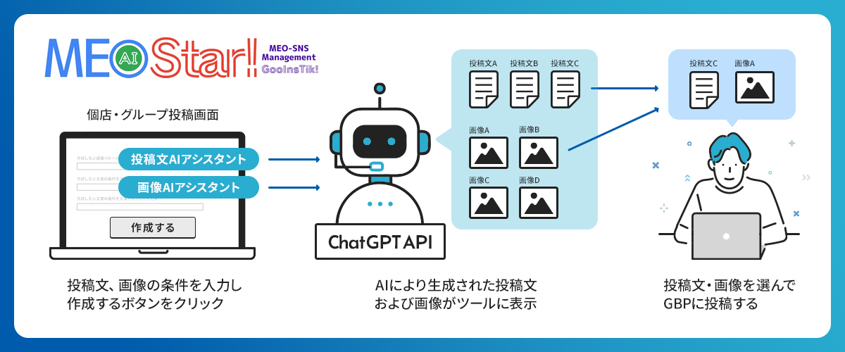 AI投稿アシスタントによって、Googleビジネスプロフィールのイベントや最新情報の投稿文章および投稿画像の生成が1クリックでおこなえる機能です。