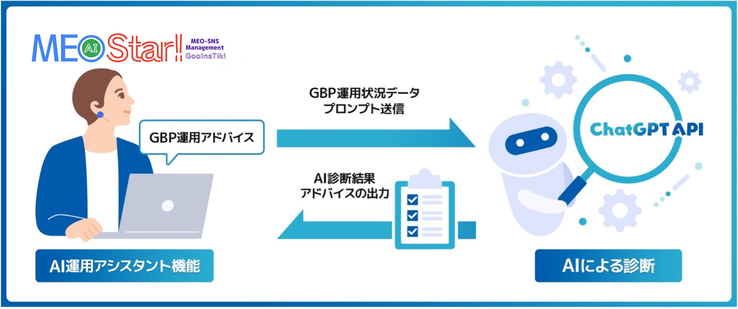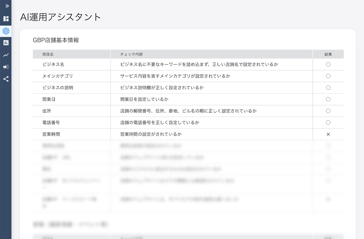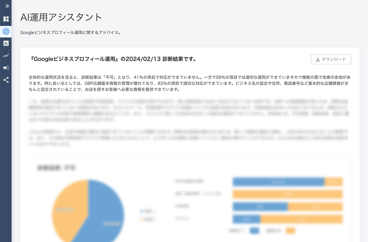GBPの運用状況を総合的に評価した結果をもとに、AIによる分析をおこない、GBP運用における詳細のアドバイスをもらえる機能です。