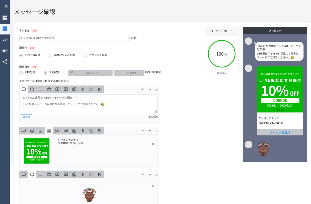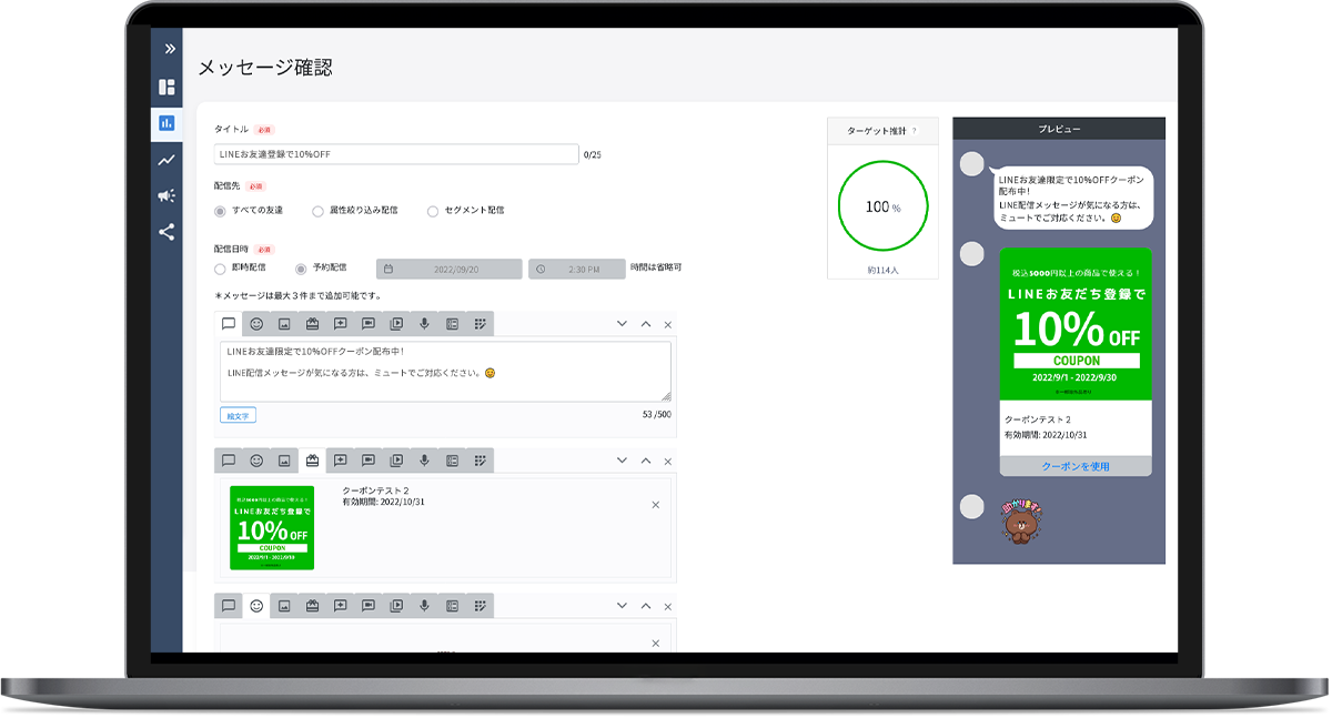 LINEの「あいさつメッセージ」や「自動応答メッセージ」の送信ができ、来店促進や休眠顧客の掘り起こしに利用できます。