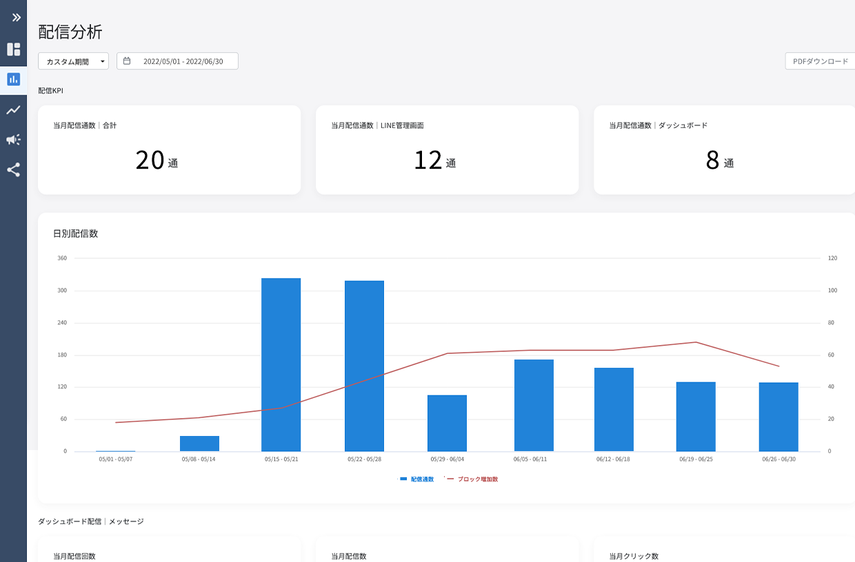 リーチ獲得数やLINE友だちになっている属性(年齢、性別、地域など)の分析や、投稿によるクリック数などの推移の分析が可能です。