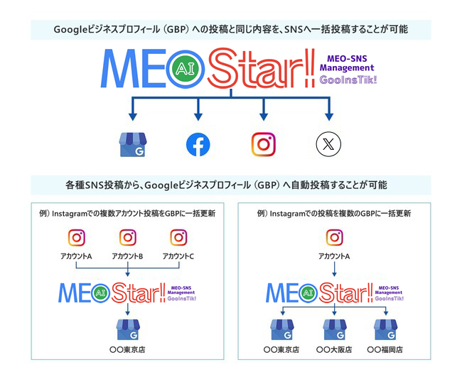 また、複数のSNSアカウント(例:InstagramアカウントA、InstagramアカウントB 等)での投稿を「MEO Dashboard byGMO」経由で「Googleビジネスプロフィール」に入力することも可能です。